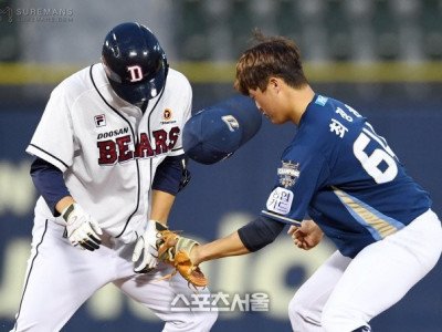 NC 2루수 최정원(오른쪽)이 23일 잠실구장에서 열린 2021 KBO리그 두산과 NC의 경기 2회말 2사 2루 상황에서 2루타를 친 두산 박계범에게 태그를 시도하고 있다. 2021. 4. 23. 잠실 | 박진업기자 upandup@sportsseoul.com