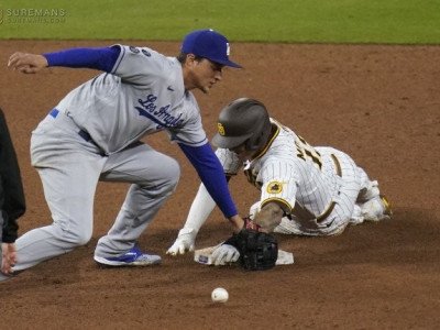지난 주말 LA 다저스-샌디에이고 파드레스 3연전에서는 원징팀 다저스가 2승1패로 위닝시리즈를 작성했다. 파드레스 매니 마차도가 다저스 유격수 코리 시거의 태그를 피헤 도루에 성공하는 모습. AP연합뉴스[LA=스포츠서울 문상열전문기자] 샌디에이고 파드레스 내야수 김하성이 LA 다저스타디움 무대를 밟는다. 다저스타디움은 메이저리그에서 보스턴 레드삭스 펜웨이파…