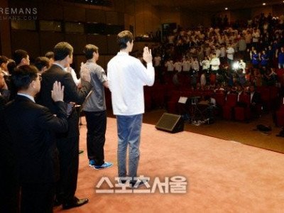 프로농구 각 구단의 감독과 주장, 그리고 KBL 회장과 임직원 등이 10일 오전 진행된 프로농구 자정결의대회에 참석해 불법과 부정 방지를 위한 10대 윤리 강령을 발표하며 이를 선서하고 있다.이날 KBL의 자정결의대회는 개막을 목전에 두고 지난 8일 오세근(KGC), 김선형(SK)을 비롯해 12명의 전·현직 남자프로농구선수들이 불법 스포츠 도박 관련으로 불…