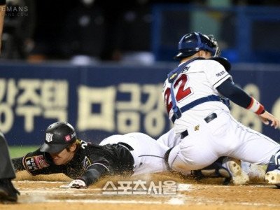 KT 배정대가 15일 잠실야구장에서 열린 2021 KBO리그 두산 베어스와 KT 위즈의 경기 7회초 2사2루 조용호 중전안타 때 홈으로 파고들어 득점을 올리고 있다. 2021. 4. 15.잠실 | 최승섭기자 thunder@sportsseoul.com