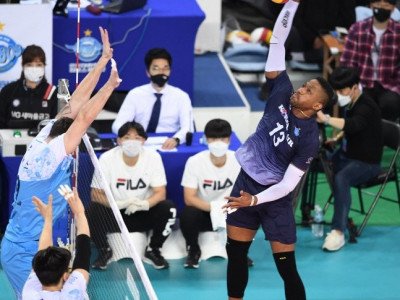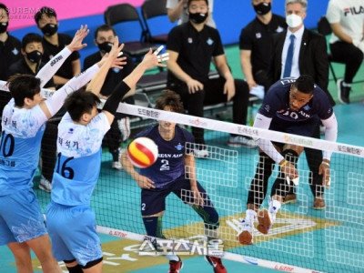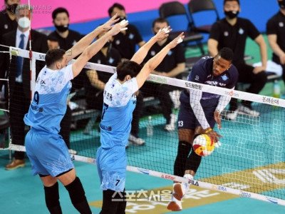 11일 인천 계양체육관에서 열린 도드람 2020-2021 V리그 남자부 대한항공과 우리카드의 챔피언결정전 1차전에서 대한항공 요스바니의 공격이 우리카드 블로킹 벽에 막히고 있다. 2021. 4. 11. 인천 | 박진업기자 upandup@sportsseoul.com