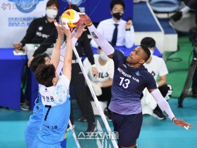 [포토]우리카드 블로킹벽에 막힌 대한항공 요스바니의 공격