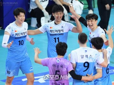 [포토]득점에 기뻐하는 우리카드 선수들