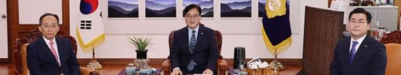 추경호 국민의힘 원내대표(왼쪽)와 박찬대 더불어민주당 원내대표가 19일 우원식 국회의장(가운데) 주재로 의장실에서 회동을 하고 있다. [사진=연합뉴스]국회가 19일 오후 2시 본회…