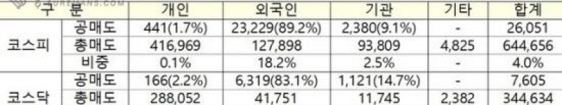 공매도 재개 이후 투자자별 거래 동향[자료=한국거래소 제공]지난 3일 공매도 재개 1주일 동안 국내 증시 공매도 거래대금 비중이 과거보다 축소된 것으로 나타났다.9일 한국거래소에 …