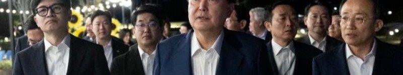 윤석열 대통령이 지난 24일 서울 용산 대통령실 앞 분수정원에서 열린 국민의힘 지도부 초청 만찬 뒤 한동훈 대표, 추경호 원내대표 등 국민의힘 지도부, 대통령실 참모진과 함께 산책…